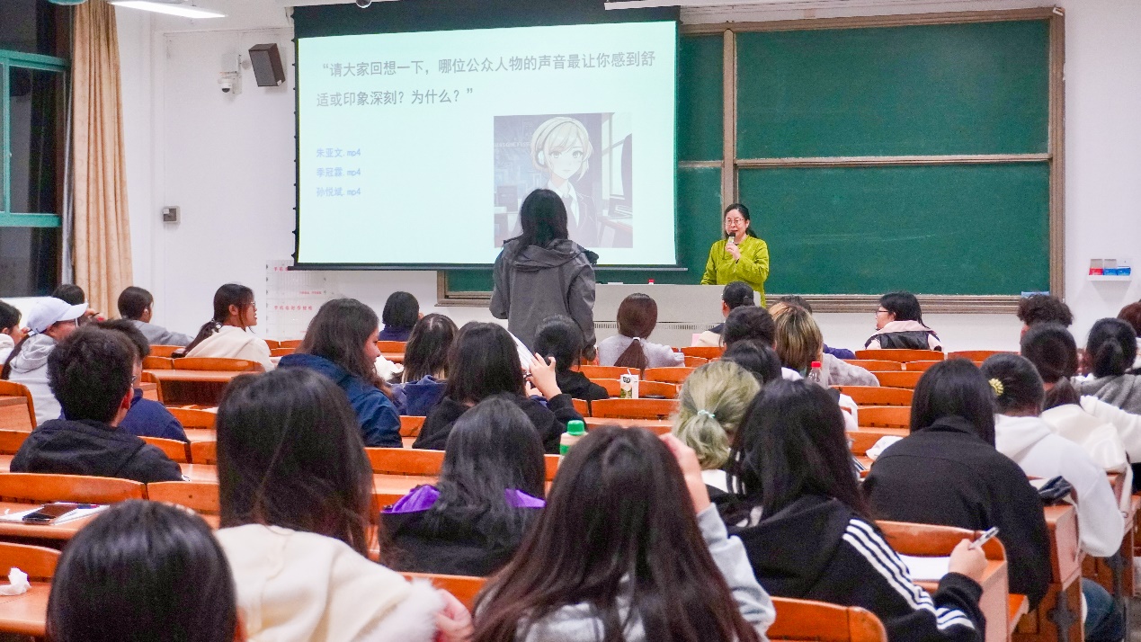 讲座以“生活中哪些声音让人感到舒适”为切入点,逐步引导师生思考声音在日常交流与艺术表达中的重要性。汤贺凤老师围绕“声音的价值”与“声音美容”的内涵展开讲解,指出声音作为“第二张脸”和“无形名片”的独特作用,激发了师生对声音训练的浓厚兴趣。她进一步阐释,朗诵不仅是一种大声诵读的语言形式,更是一门融合语言、声音与表演的综合艺术,强调通过准确的声音表达传递作品的情感与思想。
